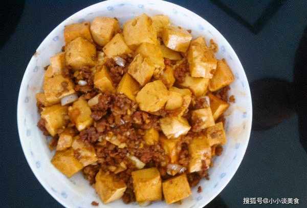 材料:豆腐、肉碎、蒜苗、蒜、姜、葱、盐、糖、生抽、老抽、料酒