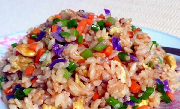 3.加入海带丝和肉碎拌匀,撒上切碎的胡萝卜;切碎的绿色和红色辣椒;加入一些鸡汤拌匀。