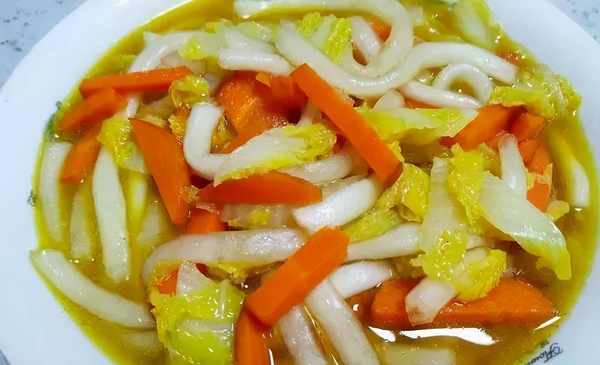 材料:胡萝卜一根,洗净切粗条;小白菜洗净切粗条;土豆粉用热水泡软,洗净沥干。