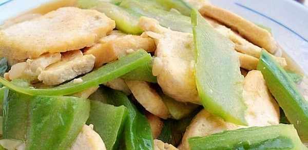 7、丝瓜炒的时候出水,加入豆腐炒。