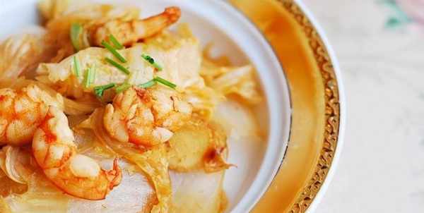 材料:白菜250克,虾仁200克,色拉油适量,洋葱适量,盐1/2茶匙,糖1/2茶匙,料酒1/2汤匙,酱油1/2汤匙,3片姜