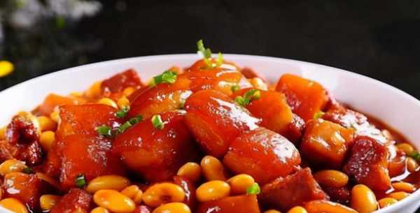 原料:猪肉600克、菜籽、料酒100克、酱油40克、葱白、白糖30克、姜片20克