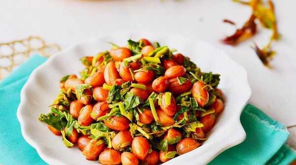 3、将揉好的花生米泡去红皮,沥干水分,加盐和香椿拌匀。