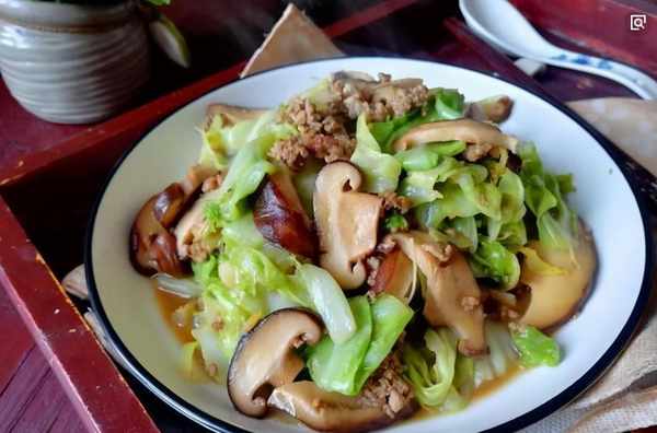 4.加入香菇片翻炒,香菇炒香,加入白菜大火翻炒,炒至白菜碎,白菜稍软