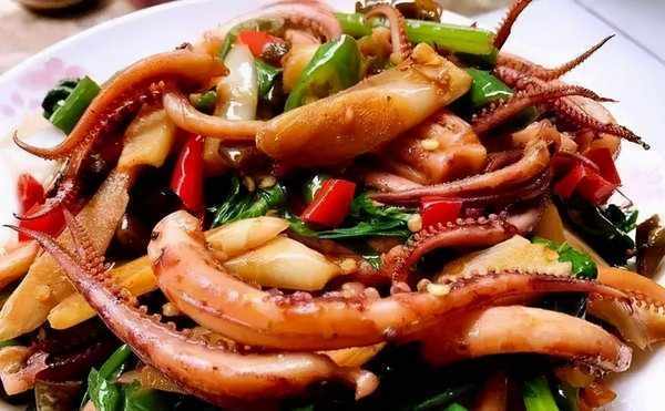 3、锅内放油,鱿鱼用旺火翻炒,加入酱油、精盐、少量味精、料酒、十三香粉等翻炒