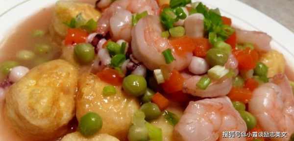 3、将豆腐倒入锅中,加入调味汁和少许水烧开,转小火煮五分钟,中间要抖动一下,以免粘锅;然后加入虾,煮一分钟;最后加入少许盐和鸡精,加入淀粉水,大火收汁。