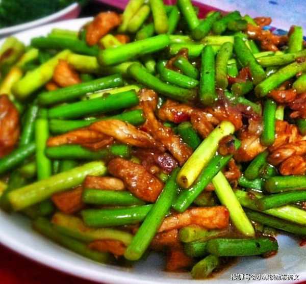原料:牛肉末150克,蒜苗3-4个,红辣椒1个,姜末适量。