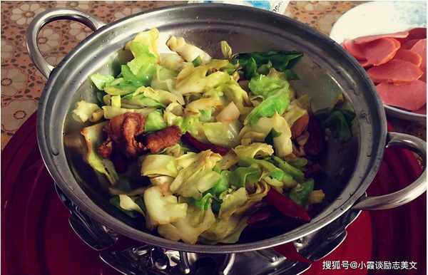 白菜洗净切成薄片,辣椒洗净切成小块。将蒜瓣切成薄片。将姜切碎。小火炒白菜片,倒入白菜叶继续小火炒。将卷心菜炒至略呈虎皮状,盛出待用。锅内倒入植物油,加入姜末炒至油热。倒入切好的大蒜,将红辣椒炒香。倒入白菜片,大火翻炒。加入切碎的盐并充分搅拌以将其从锅中松开。