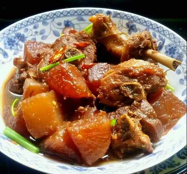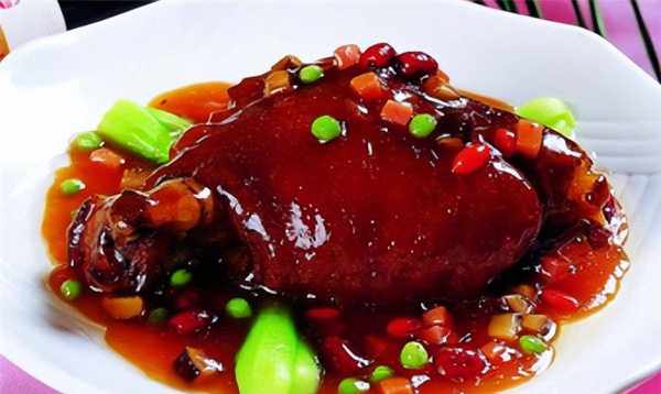4、肉上色后,放入清水中,直到水位没过肉的表面。加入八角、桂皮,盖上锅盖大火煮至沸腾,转小火煮15分钟,加入适量盐,再煮15分钟后转大火炸至肉汤。晾干,加入鸡汤即可食用。