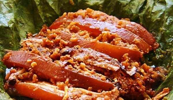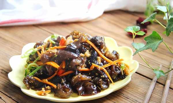 2.将植物油放入锅中加热。待下面的排骨炸成紫色时捞出,另开一锅,倒入250克水,加入白糖和桂花酱烧开,转小火,倒入。将厚朴、莲子、银杏、荸荠、胶条各切片,煮至浓汁,淋上花椒油,装盘即食。