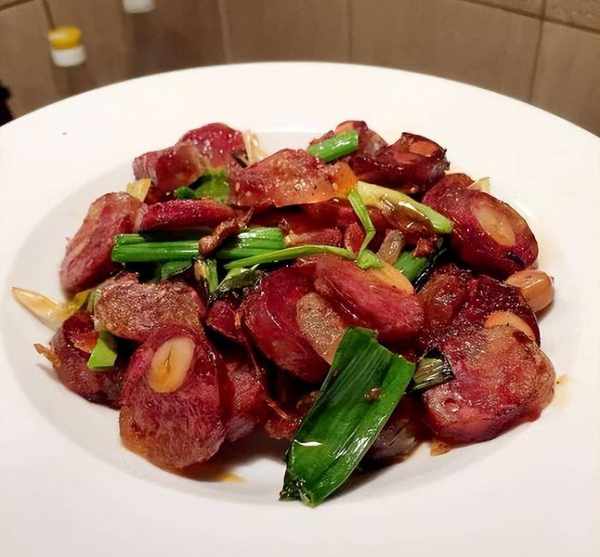3、干锅以葱为底,放入干炒好的香肠,撒上胡椒粉和葱花。