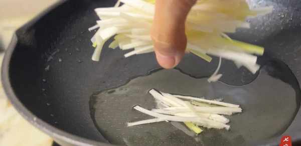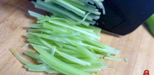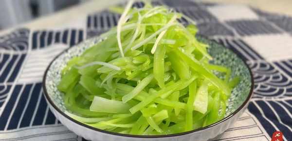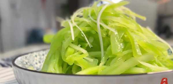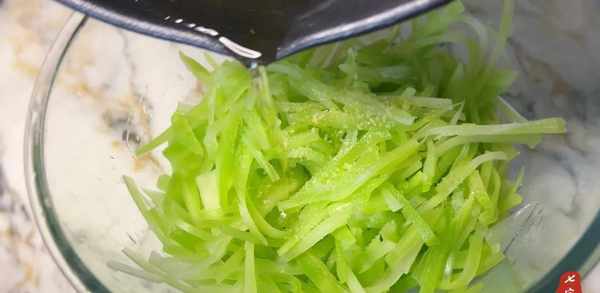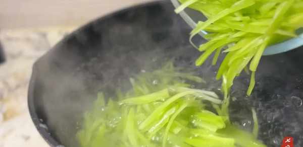 3、锅中加水烧开,倒入几滴煎炸油,然后将生菜丝倒入锅中煎半分钟,捞出过凉水备用。