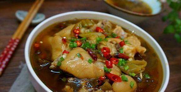 3、加入适量清水。大火煮开、小火慢炖1个小时。炒锅倒一点油,入酸菜炒出香味,然后加入猪蹄中。