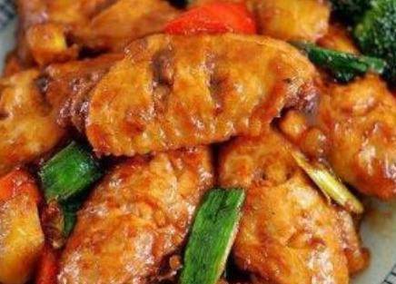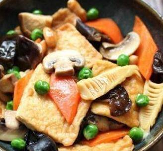 3、锅烧热,加入少许油,加入姜片炒香,加入坚果和胡萝卜炒香,再加入香菇、香菇、香菇和春笋炒至9,放入炸豆腐。和青豆解冻并炒了一会儿。