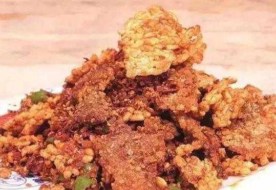 3、锅内留底油烧热至50%,加入青红辣椒圈15克炒香,加入蒜蓉牛肉酱10克炒香,辣椒35克,辣椒30粒克孜然粉。之后立即加入炒好的牛肉和锅巴,用大火搅拌均匀。