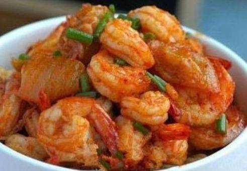 3.韩式辣白菜改刀成寸段;起油锅加热至四、五成,滑炒虾仁后盛起;