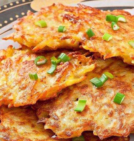 4。将两面煎至金黄,然后从锅中取出,趁热撒上洋葱。