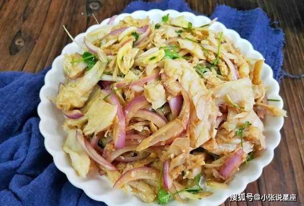 材料:海兔鱼干、洋葱、蒜、醋、生抽、盐、蚝油、香油、香菜