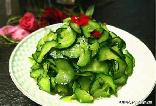 4、黄瓜片15分钟后出水,用力挤去水分,下油锅大火爆炒30秒出锅,可保持黄瓜片的清脆;