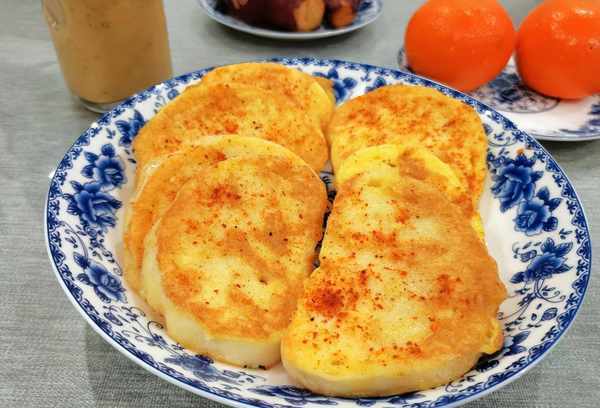把自己蒸好的大馒头切成片,把馒头放在一碗水里蘸一下,然后放入蛋液里,刷上一层蛋液,然后放入油炸平底锅,煎至金黄色,两面撒上盐和胡椒粉,装盘。