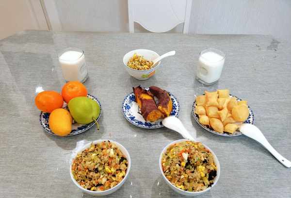 鸡蛋海苔拌饭,烤地瓜,豆腐皮泡泡,热牛奶,水果有芒果,橙子,梨子。