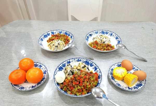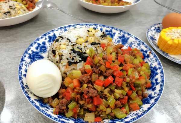 早餐,孩子们喜欢吃蔬菜丁和拌饭。晚上约饭。准备煮熟的牛肉和所需的蔬菜。早上起来,蒸玉米和鸡蛋。洗净后,将煮熟的牛肉和蔬菜切成方块,放入锅中油炸。把它倒在米饭上。