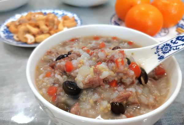 水煮牛肉切小方块,胡萝卜、山药切小方块,黑豆、大米、小米洗净,将所有材料放入电饭煲,加没过材料的水,撒半勺盐,半勺五香粉几滴味道很鲜,几滴香油,盖上罐子,算好时间吃早饭,按下粥键,早上开罐子吃。