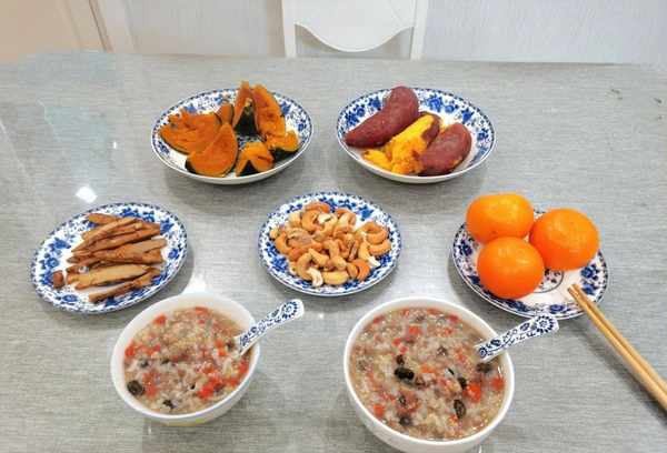 五谷杂菜牛肉粥,蒸红薯,蒸贝贝南瓜,五香豆腐干,一盘腰果,水果窝坎。