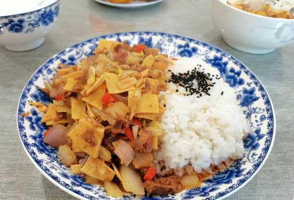 我和我的孩子早餐吃了一盘石锅拌饭。这道菜是用煮牛肉、豆腐皮、洋葱和胡萝卜烤制的。出锅前撒上孜然粉,有浓郁的孜然香味。