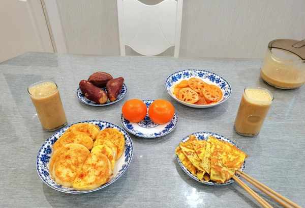 煎蛋煎饼、椒盐馒头、红油藕片、红枣、枸杞、黄豆、小米、豆浆、烤红薯、橘子。
