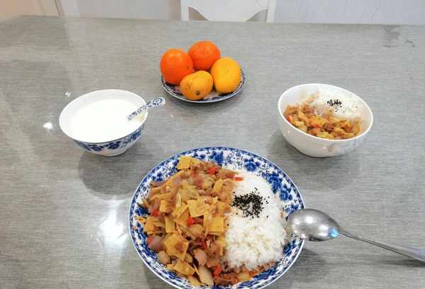 牛肉豆腐皮拌饭,温牛奶,水果是芒果和柑橘。
