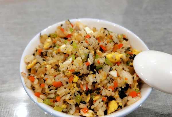 鸡蛋紫菜拌饭的做法:晚上约饭,早上起床煮三个鸡蛋,鸡蛋洗净去皮切碎,然后切一些胡萝卜,芹菜,少许芥末,倒入半碗紫菜,放入所有的材料在电饭煲里,和米饭搅拌均匀,就可以享受美味了。