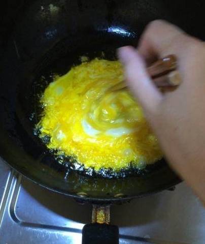 这个时间就可以先炒鸡蛋啦可以多放点油一会v拌馅儿时就不用再放了油刚有点热时就放鸡蛋也是用筷子搅