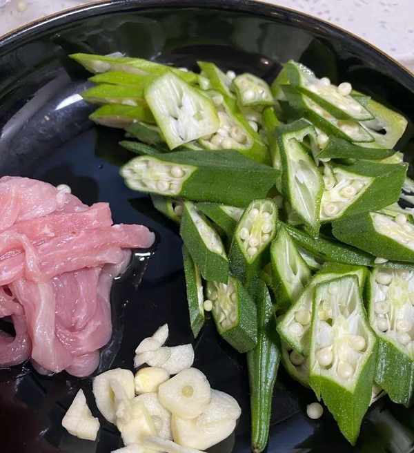 第一步先把瘦肉切好,根据秋葵的量看需要多少肉。总的来说,我遗漏了一些。毕竟炒秋葵有点无聊。秋葵斜切,瘦肉切片,大蒜切片。