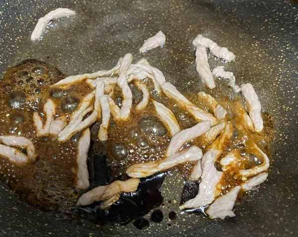 第二步,锅中油烧热,将肉煎至变色。然后放生抽、肉碎炒香。