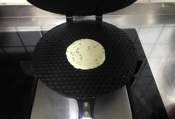 3.先用煎蛋机小火加热,然后倒入1茶匙混合均匀的面团,如图。