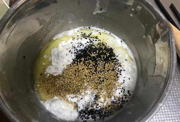 原料:低筋面粉(又称糕粉)100克、牛奶140克、玉米油55克、普丁、鸡蛋1个、黑白芝麻10克