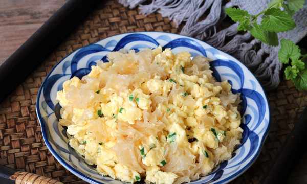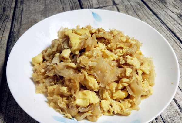 3、然后将葱、姜洗净,去杂质,葱切碎,姜切碎;锅内油烧热,加入姜末炒香,倒入蛋液,炒熟即成;