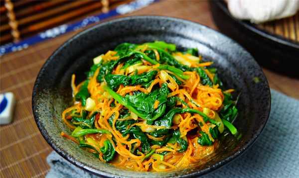 3.然后热锅烧热油,将切好的大葱和蒜末炒香,放入切好的胡萝卜,稍微炒一下,下菠菜,加少许酱油,蚝油,胡椒粉,加盐并继续。搅拌煮熟并品尝,直到配料准备就绪;