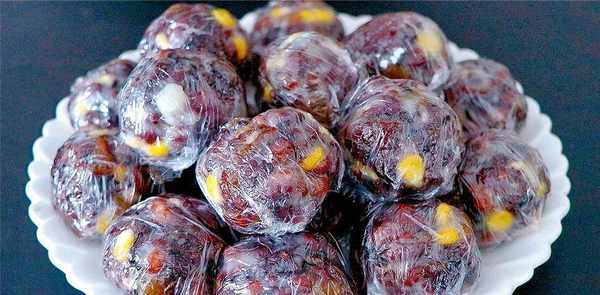 2.红枣洗净,去核切丁。粗粮煮沸放凉,加入一碗玉米粒、红枣丁、葡萄干、蔓越莓和适量白糖拌匀,加入一碗糯米粉拌匀,抓一把揉成球,裹上一层干糯米粉,盖上一层水,再盖上一层糯米粉,生胚就做好了。