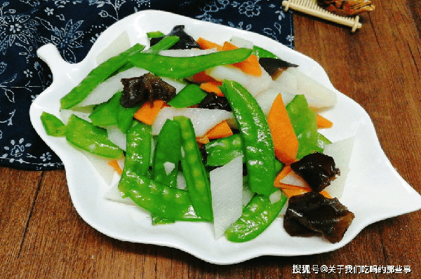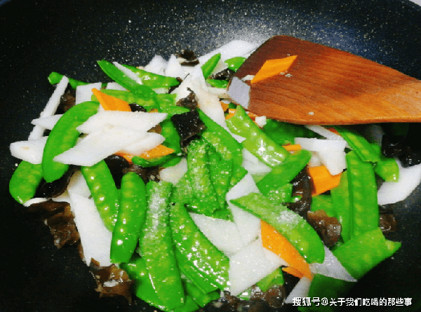 3、蒜瓣切末,起锅烧油,翻入蒜末爆香,倒入荷兰豆翻炒1分钟,断生后放入黑木耳、山药片、胡萝卜片,继续翻炒1分钟,加入适量食盐、鸡精、白糖调味,翻炒入味后即可出锅。