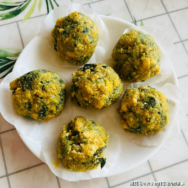 3、向菜馅里加入一勺玉米粉拌匀,捏成乒乓球大小的菜团子,放进玉米面里滚一滚,裹上一层薄薄的干粉。蒸锅加水烧开,放入菜团子蒸10分钟,即可取出食用,皮薄馅大真好吃。
