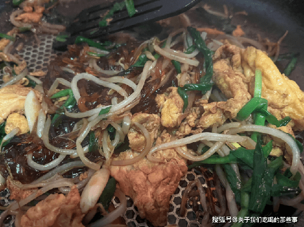 3、锅里留底油,下入葱蒜末、干辣椒炸香,倒入豆芽炒1分钟,断生后放入韭菜段、粉条,继续炒1分钟。淋入碗里的料汁,倒入鸡蛋块,大火翻炒收汁,汤汁浓郁后即可出锅。