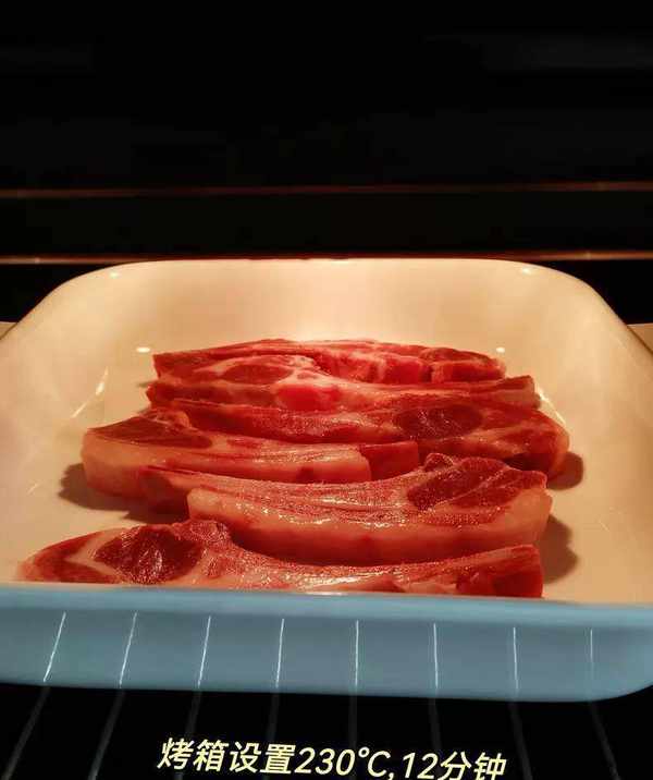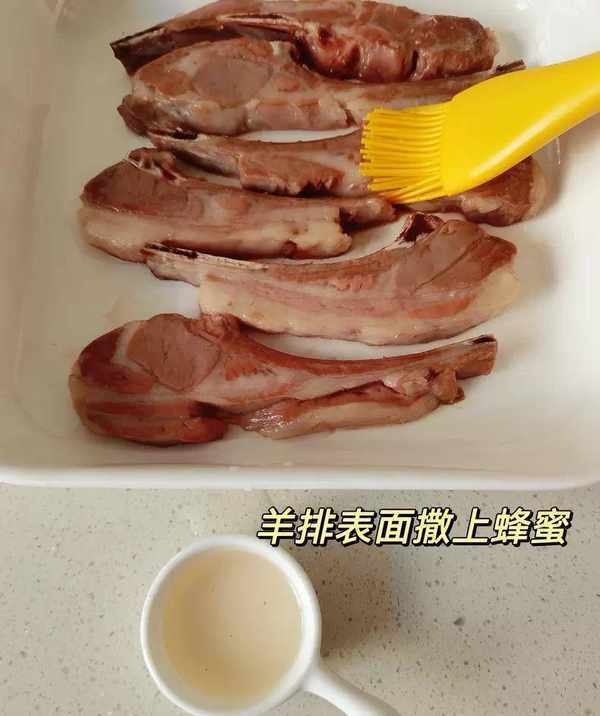 首先,预先打开羊排。然后准备蜂蜜和水,将它们混合制成蜂蜜水。然后将烤箱预热至230°C,将羊排放入烤箱烤6分钟后取出。