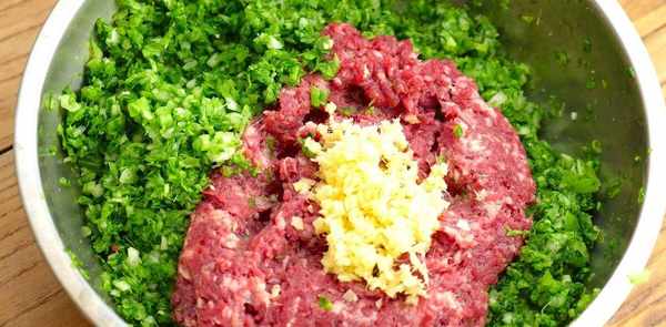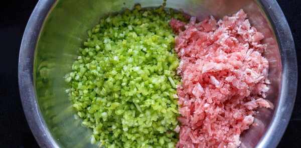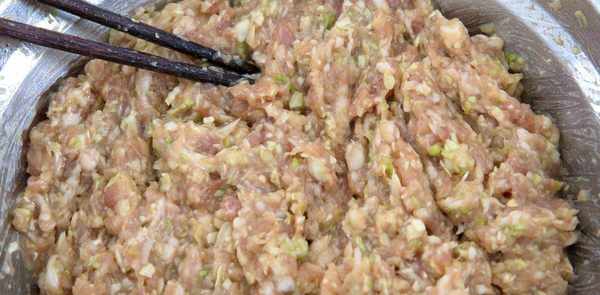 准备饺子和馄饨馅时,在肉馅中慢慢加水,用筷子朝一个方向搅拌。当肉馅有点稀时,加盐。馅料里瘦肉多的可以多加水,肥肉多的就少加水。然后将切碎的蔬菜和肉末拌匀,不要过度,否则汤会流出来。如果做汤的话,可以拌入干意面,或者放冰箱或者外面晾干,一出油就减掉。