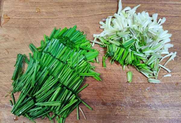 1、将采摘好的野葱放入锅中,用手剥去野葱的皮。去皮的时候,我们可以把它们泡在水里,这样更容易去皮。去皮后放入盆中,加适量清水漂洗干净,放在砧板上切块,切好放入盆中待用;
