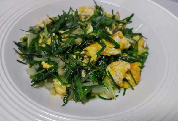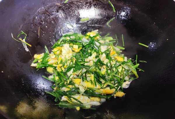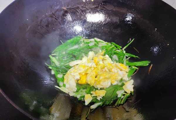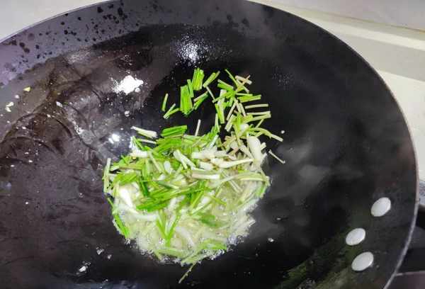 3.将野葱叶倒入锅中。叶子放入锅中后,用锅铲将它们翻过来,炸至光滑。快炸可以搅拌均匀,炸好后倒入鸡蛋;