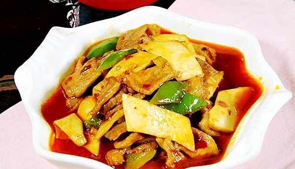 10、锅内留少许底油。油热后转中小火,放入肉片翻炒至变色(肉片用中小火炒,以免肉片煮过头)。