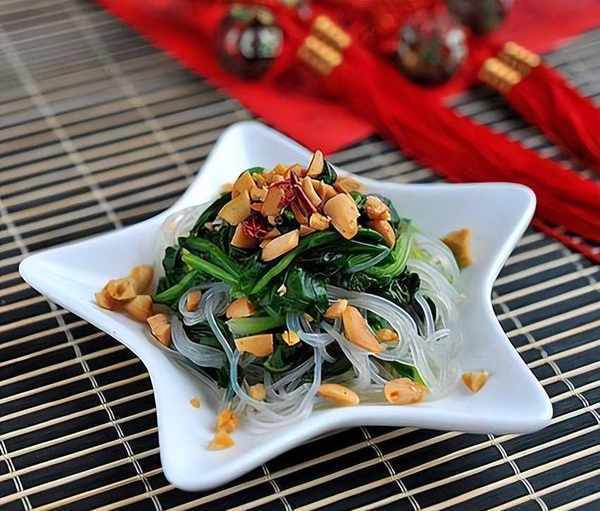 3、粉丝用剪刀剪短,和菠菜部分一起放在一个大碗里,加盐、醋、糖和鸡高汤拌匀,倒入香油拌匀。将拌好的粉丝和菠菜装盘,撒上黄飞鸿花生米。边吃边拌匀