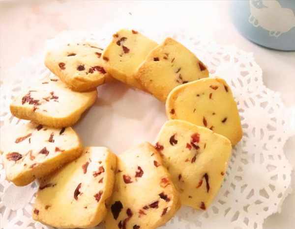 【材料】低筋面粉230克,蔓越莓干70克,糖粉110克,黄油150克,蛋液1个